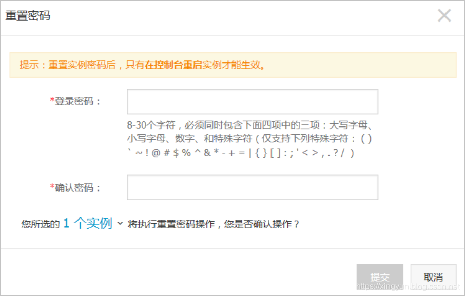 - 对于正在运行的实例,您需要在重置实例登录密码后重启实例才能使新密码生效。重启操作可能会对您的业务造成影响,请提前规划好操作时间,建议在业务低谷时操作,将影响降到最低。