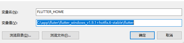 变量名: FLUTTER_HOME 变量值: C:\app\fluter\flutter_windows_v1.9.1+hotfix.6-stable\flutter