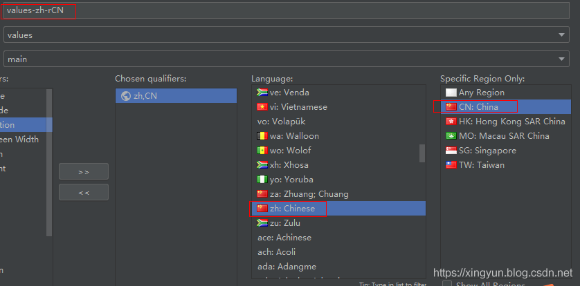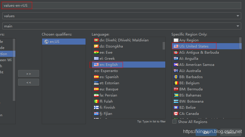 例如:values-zh-rCN(中文)和values-en-rUS(英文)