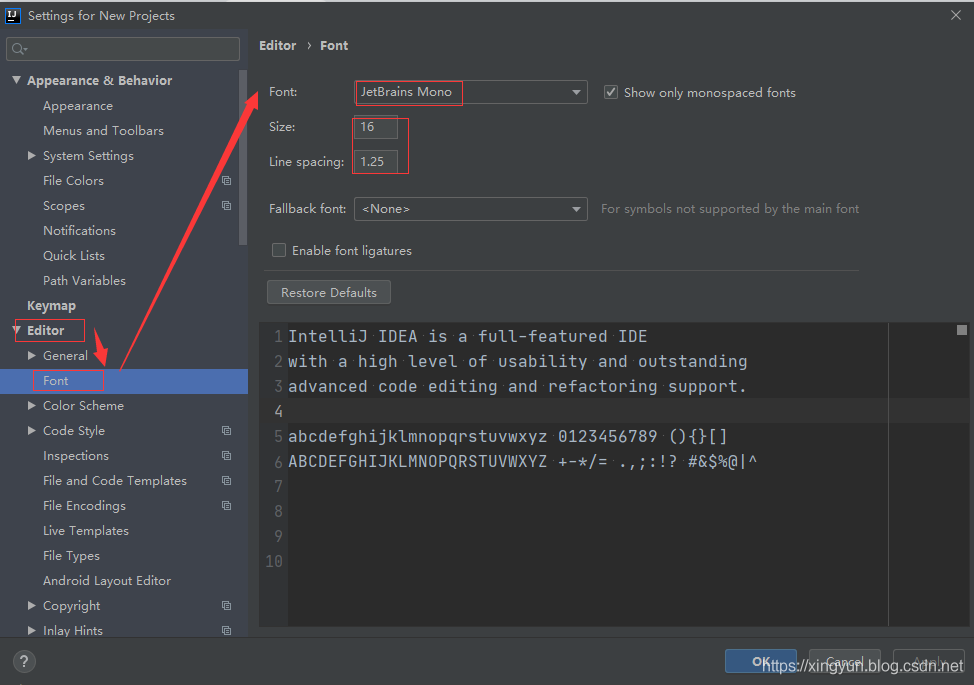 Editor ——》Font ——》字体类型修改为 JetBrains Mono