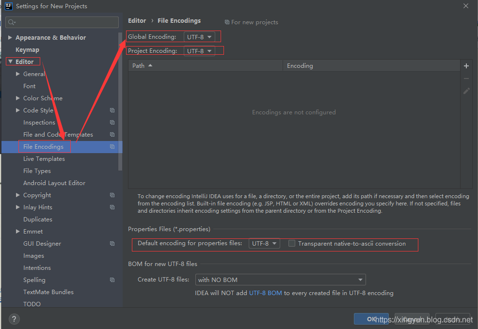Editor ——》 File Encodings ——》 字符编码修改为UTF-8 如下所示: