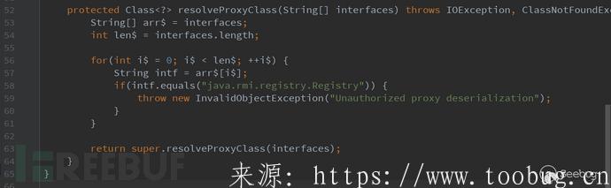 首先我们来看以下 CVE-2017-3248 这个漏洞的补丁(p24667634_1036_Generic),在weblogic.rjvm.InboundMsgAbbrev$ServerChannelInputStream.class多了一个resolveProxyClass ,这个resolveProxyClass只是对 RMI 接口类型进行了判断,判断 RMI 接口是否为java.rmi.registry.Registry,是的话抛出错误。