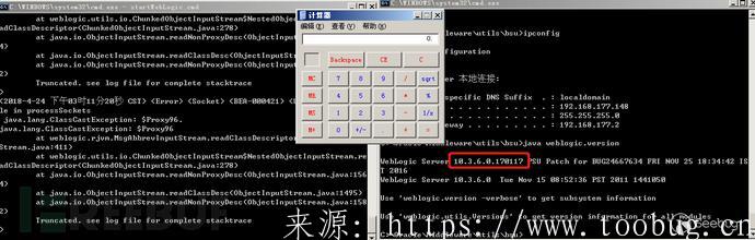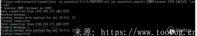 使用 t3 协议脚本发送 p_client2,可以看到JRMPLister有请求过来了,客户端命令也执行成功了。