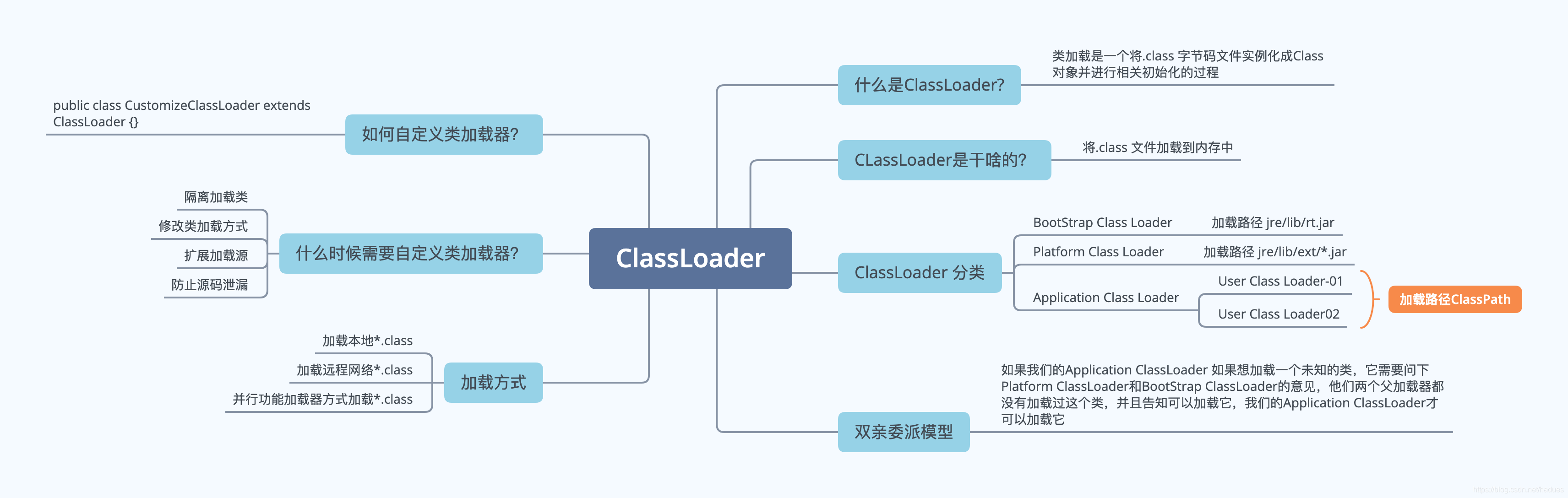 ClassLoader 是一个类加载器,主要用于将*.class 信息加载到JVM 的不同区域中.
