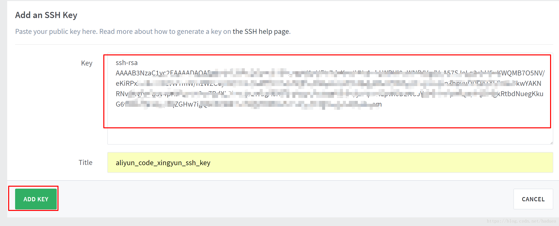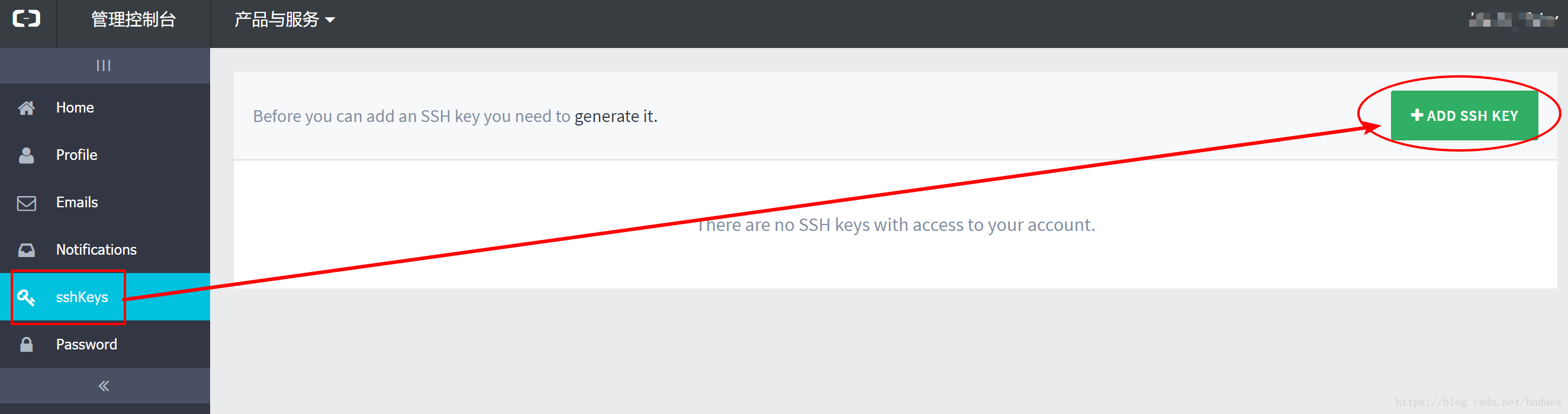 打开阿里云管理控制台 点击右上角的ADD SSH KEY
