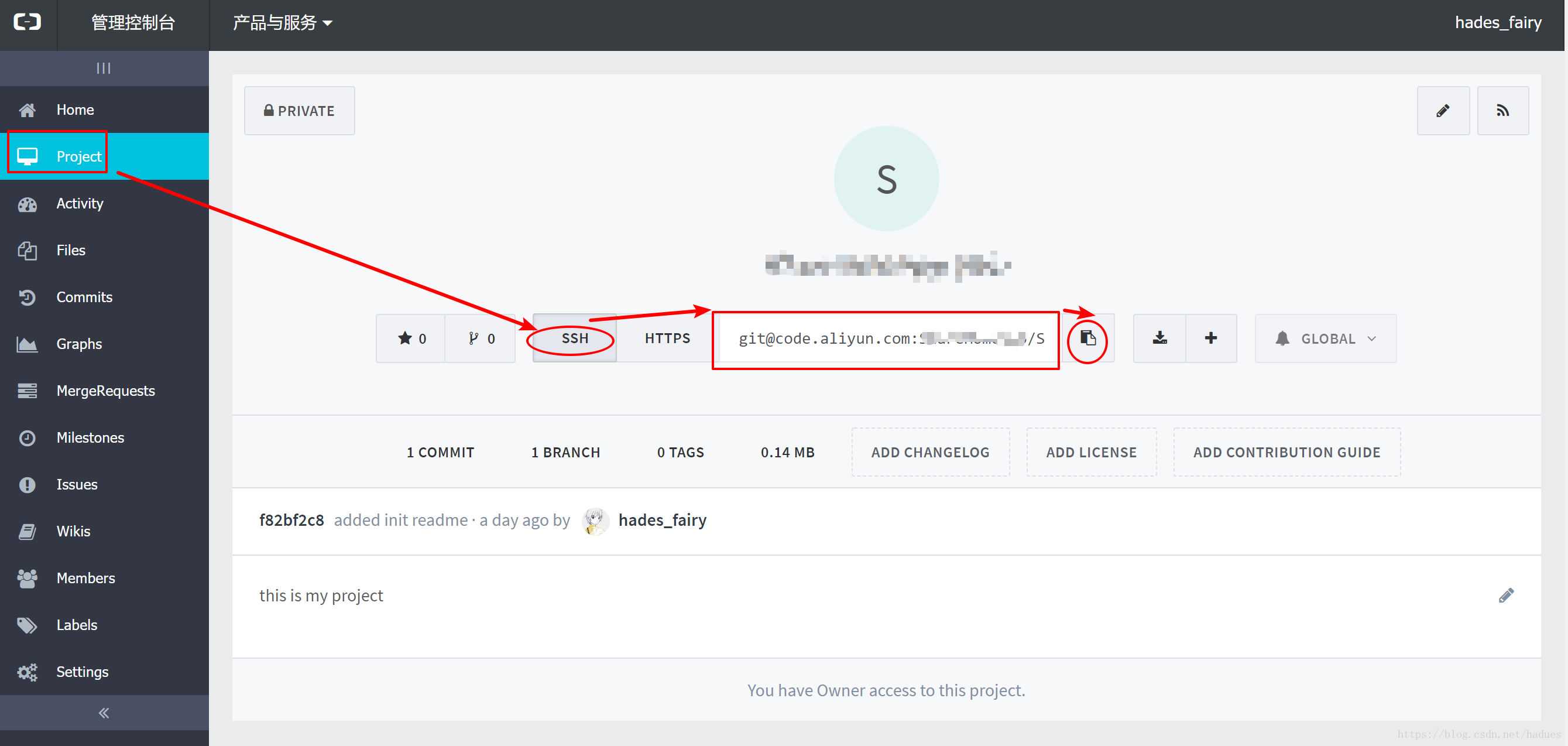 在Git的术语中,拷贝一个项目的过程叫做“克隆”。为了能够在您的本地计算机上对项目进行修改,您需要先克隆它。为了对代码进行克隆,首先要登入阿里云Code。为了能够在本地修改该项目,首先您需要拷贝该项目的基于SSH的或HTTPS协议的链接。在设置完成之后,可以很轻松地使用基于SSH协议的链接。在项目页面上,点击屏幕右边的HTTPS或SSH按钮。然后拷贝此链接(下一步需要将这个链接拷贝到您的shell中