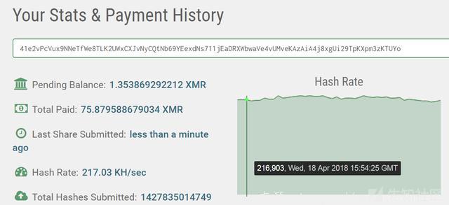 拿到黑客的钱包地址后,我们在某个矿池中发现该黑客已经获得了75.87个门罗币,根据市场门罗币的行情预估,该黑客单在这一个矿池中就已经牟利11W,而且该地址的门罗币数量再以每天两个的数量在递增,其中利润之大可见一斑。