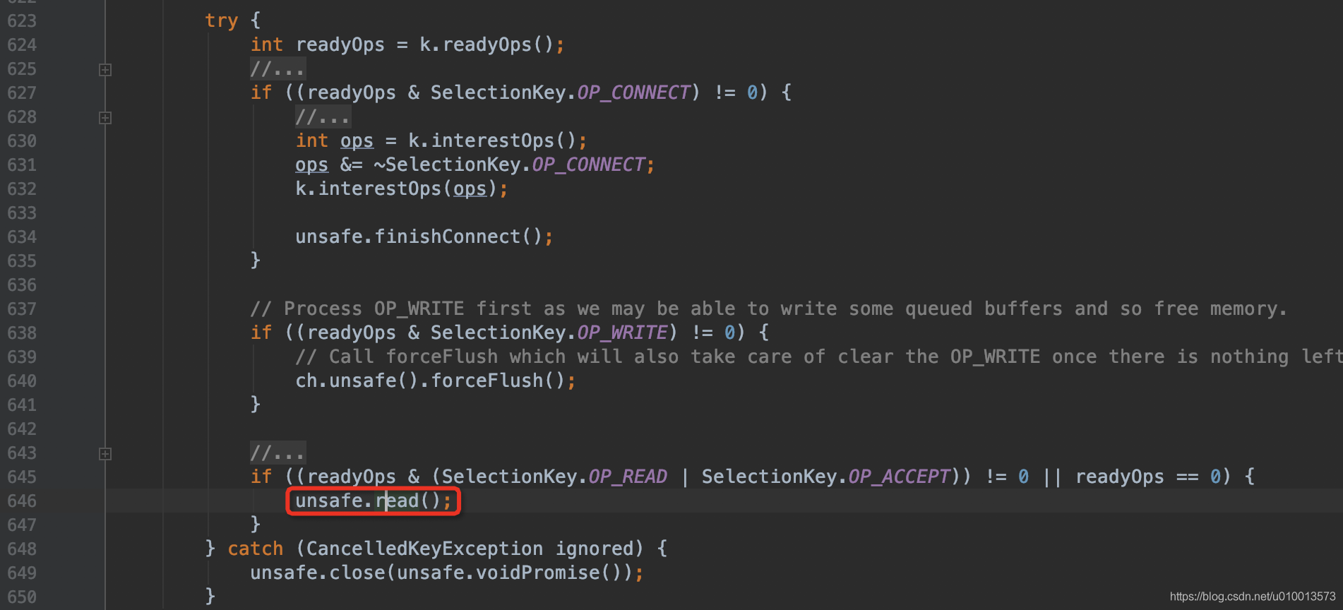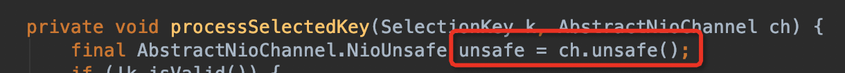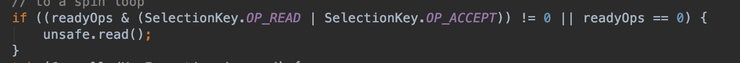 - 但是从源码可知,child是通过Object了下的msg通过强制转换而来的,也就是说在调用ServerBootstrapAcceptor的channelRead时,msg是已经创建好了的,为SocketChannel类型的变量,但是底层是在哪里创建好的呢?而ServerSocketChannel也是注册在bossEventLoopGroup的一个eventLoop的selector中的,通过该selector监听客户端的连接请求事件,即通过SelectKey获取OP_READ或OP_ACCEPT事件,如下: