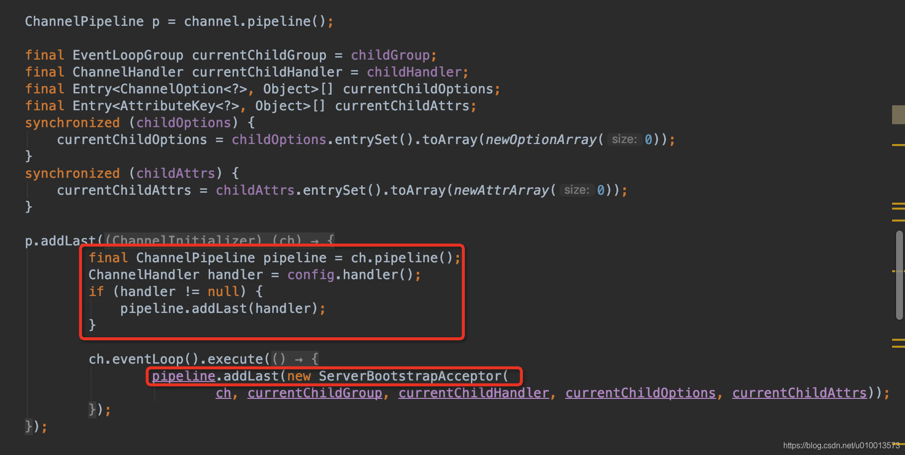 其中ServerBootstrapAcceptor为pipeline中的最后一个ChannelHandler,如图在创建ServerSocketChannel时添加的: