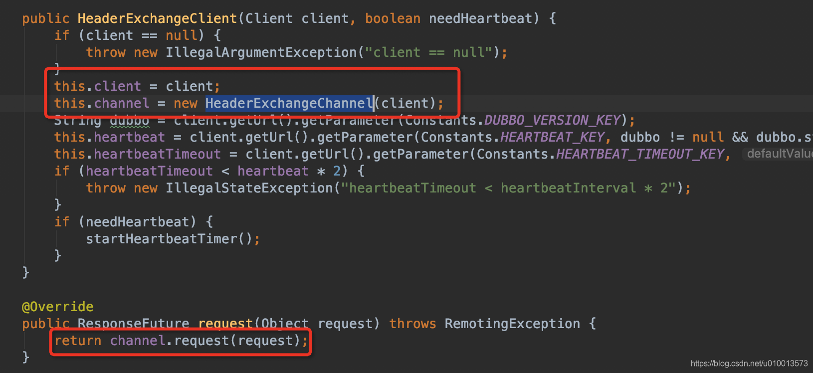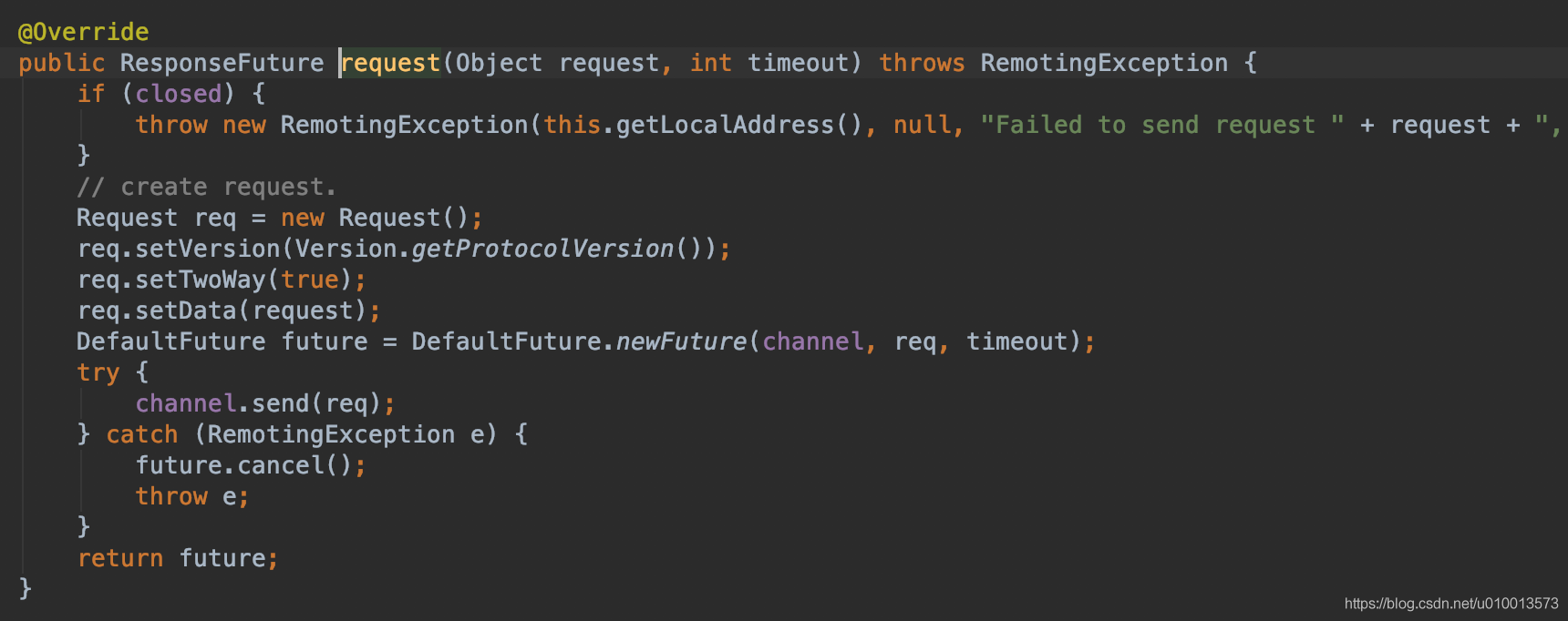 - 底层HeaderExchangeClient调用:通过一条绑定的Netty长连接的channel发送请求Request,返回一个DefaultFuture(ResponseFuture的子类)