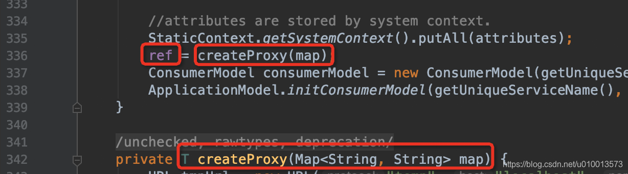 createProxy(map)的实现:refprotocol为DubboProtocol的实例,refer方法生成DubboInvoker实例,最后封装到服务代理refer中: