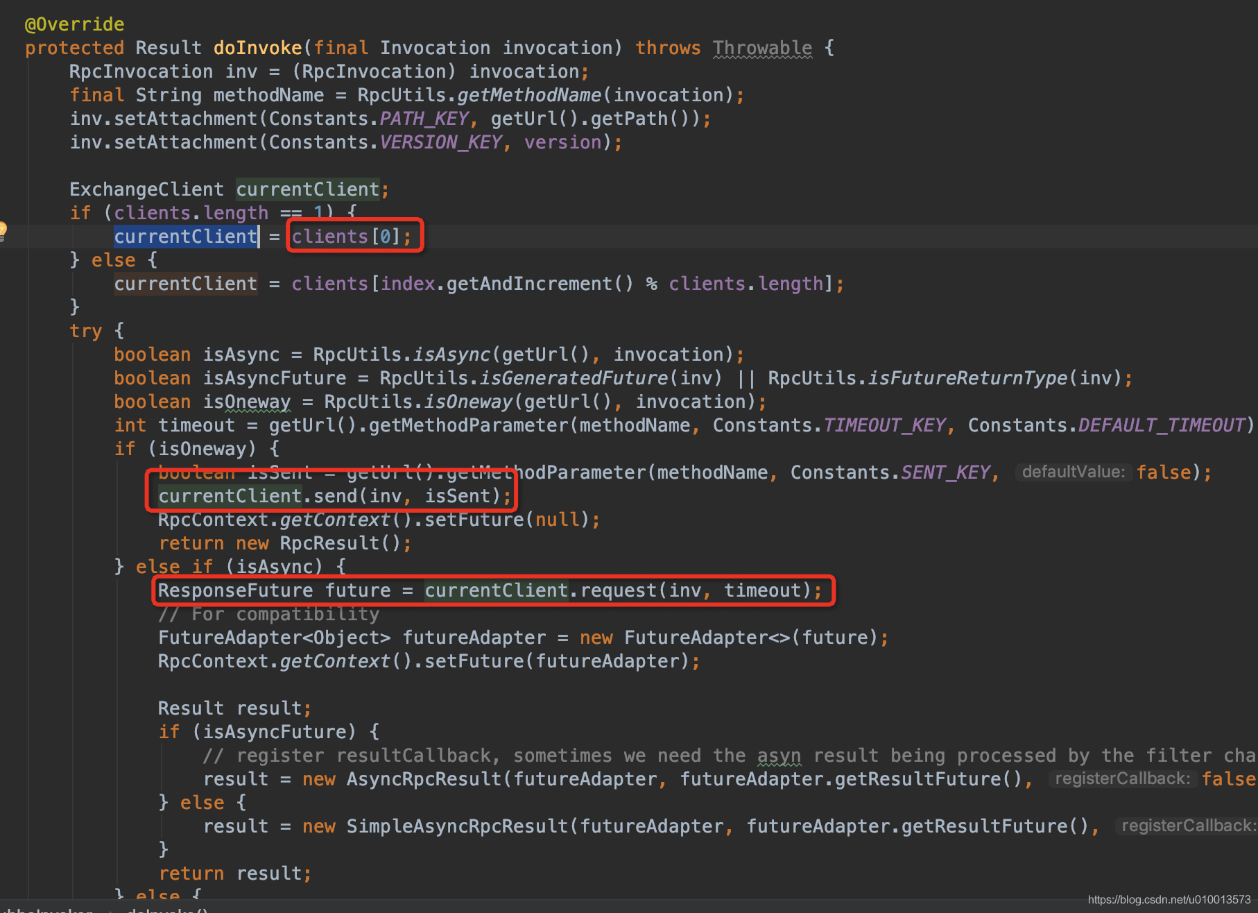 DubboInvoker的doInvoker:对远程服务进行调用,使用client发送请求,根据是否是异步,返回ResponseFuture或者阻塞等到结果返回。