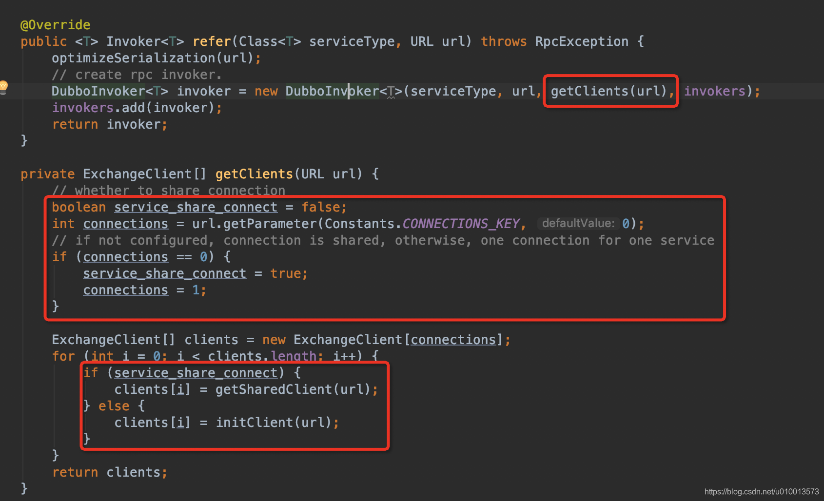 - DubboProtocol的refer方法的实现:getClients获取底层通讯的client实例,默认为netty的client。根据connections参数,即Constants.CONNECTIONS_KEY,默认数量为1(即单一长连接),即所有调用这个服务代理refer的线程,使用同一个连接发送请求和接收响应。