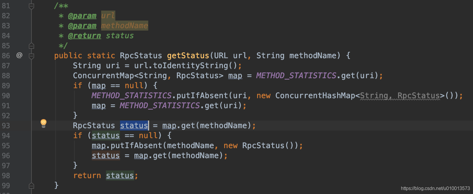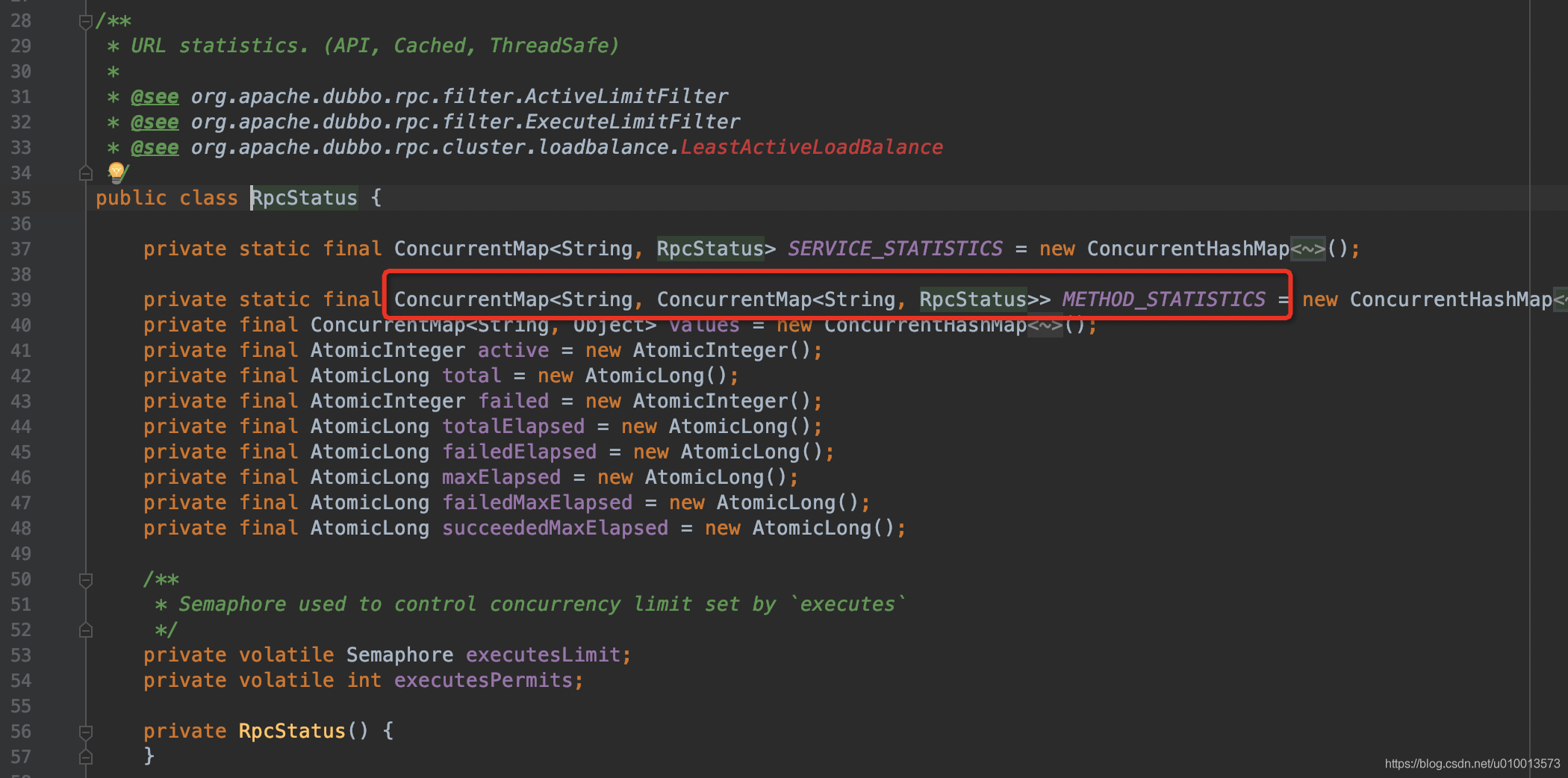(2)METHOD_STATISTICS:方法统计缓存。key为uri,即服务providerURL,value为ConcurrentMap<String, RpcStatus>,其中这个key为方法名methodName,value为该方法的统计RpcStatus实例。