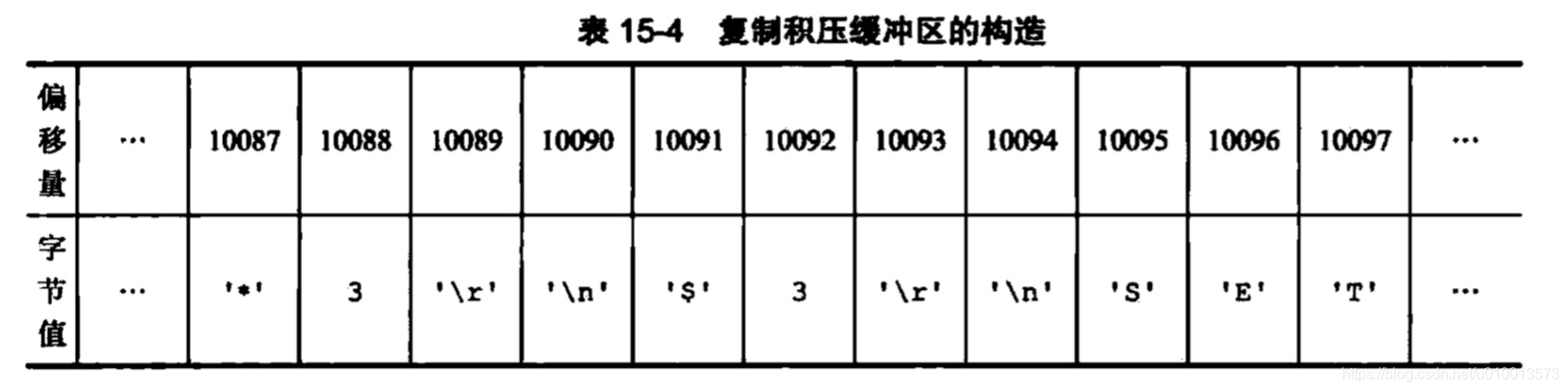 - 缓冲区的更新:主服务器的复制偏移量和复制积压缓冲区的更新是在主服务器在每次向从服务器传播了N个字节,则将自身的复制偏移量加上N。其中该N个字节的数据是一个写命令(即写命令+写数据)。同时将该次的写命令写入复制积压缓冲区中,写命令的每个字节在复制积压缓冲区都对应一个偏移量,如图: