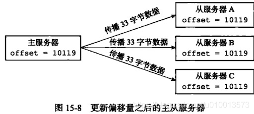 - 所以如果主从服务器之间的复制偏移量是相等的,表示主从服务器之间数据一致;如果从服务器的小于主服务器的,则表示从服务器落后主服务器,这种情况在从服务器断线重连之后可能会发生。具体过程如以下示意图:(图片均引自黄建宏的《Redis设计与实现》)