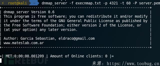 然后我们在服务端执行dnmap_server -f execnmap.txt -p 4321 -t 60 -P server.pem