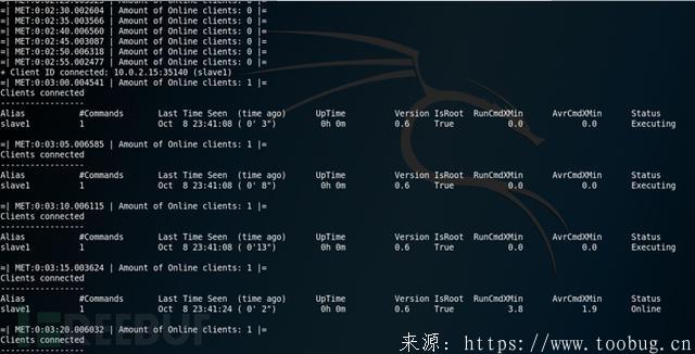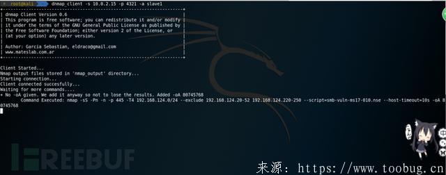 在客户端执行 dnmap_client -s 10.0.2.15 -p 4321 -a slave1 就可以连接上服务器进行分布式扫描了