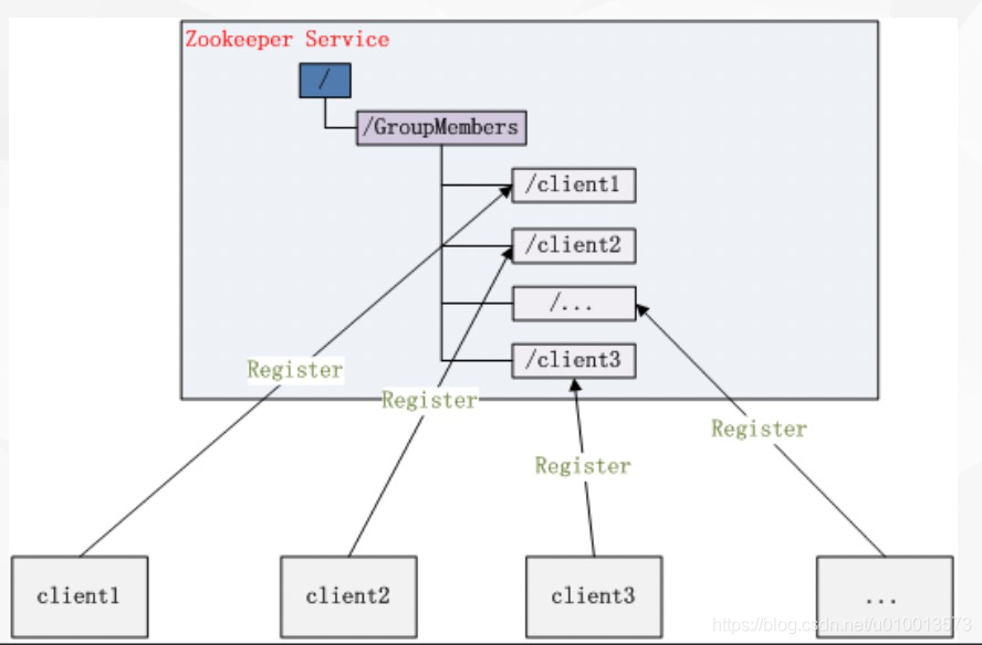 集群管理是zookeeper的最初的一个运用场景,主要首先创建一个父目录节点,这个父目录节点代表一个集群,即可以将该目录节点的名称设置为集群名称,如cluster1,然后在该父目录节点下面创建多个子目录节点,其中节点类型为临时节点,每个子目录节点存储集群的一个机器节点的信息,具体如图所示:每个client节点代表一个机器节点