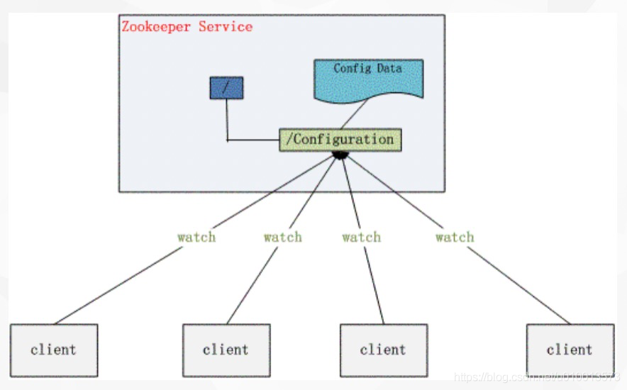 - 为了避免当系统配置文件修改时,需要将配置文件更新到每个部署节点本地,可以将配置文件放在zookeeper的一个持久目录节点中,各个部署节点通过对该目录节点设置监视器watcher来实时获取该节点的数据内容变化,从而获取最新的配置文件信息,如图: