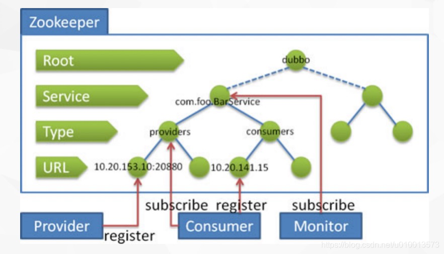 - 命名服务主要是利用了zookeeper的目录树的路径引用唯一的特性,所以可以通过一个完整的路径引用来唯一命名一个服务,如zookeeper作为dubbo的服务注册中心,每个目录节点代表某个Service的完整包名的一部分,完整路径代表一个Service。除此之外在底层节点保存当前的服务提供者和服务消费者ip信息,如图:
