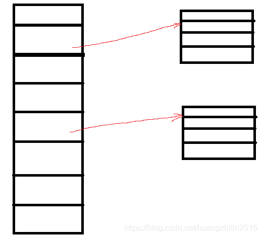 很多人的第一反应可能都是,二维数组嘛,简单!我们就在一维数组的基础上进行扩展:一维数组中的每个元素又是一个一维数组。当然,这种结构看起来是没有问题的,能够达到我们二维的要求。如下图所示: