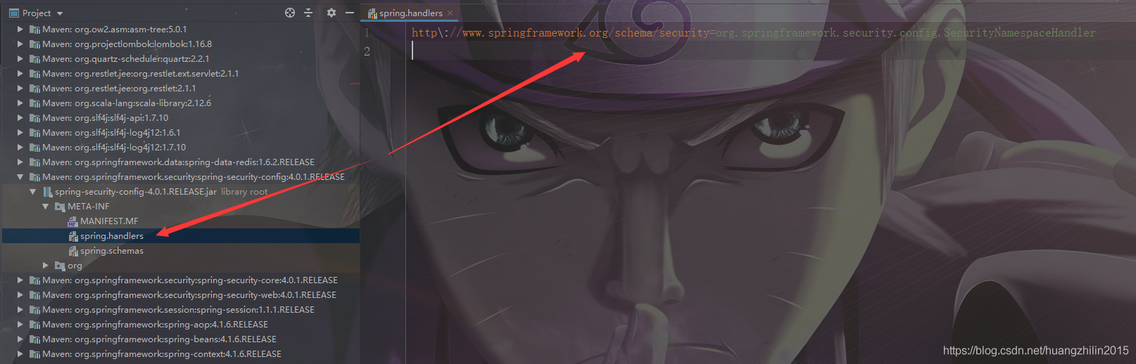就是箭头指向的这个:xmlns="http://www.springframework.org/schema/security"。它是干嘛的呢?spring在解析该xml的是时候,会先拿到这个namespaceUri,然后根据这个uri去获取它的解析器类全限定名,怎么获取呢?这就要说到spring的:/META-INF/spring.handlers这个文件。这个文件里面配置了一些uri和类全限定名的对应关系,spring会加载这些handlers文件,然后将其放到一个叫做handlerMappings的Map里面,key为uri,value则为类的全限定名。