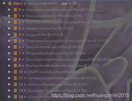 而这个filter列表有很多的filter,下图是我本地项目打断点截的图,可以看到有15个filter(其中有我自己加的filter),每个filter都有自己的作用,密码验证相关的、记住密码的等等,我们主要看和权限验证相关的:FilterSecurityInterceptor(下图中的最后一个)