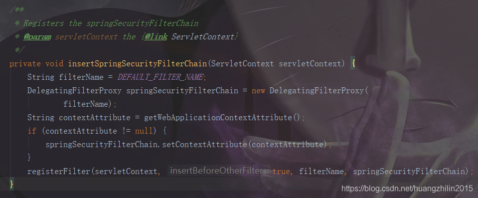 我们可以看到,它实现了我们上面提到的WebApplicationInitializer接口,并且实现了onStartup方法。在其onStartup方法里做的工作里就包含有一项操作:注册springSecurity的过滤器,并且该过滤器是通过DelegatingFilterProxy实现的(delegate为FilterChainProxy,是通过上图中的DEFAULT_FILTER_NAME从WebApplicationContext中获取的,而context中的bean是通过WebSecurityConfiguration注入其中的,且指定了名称为该DEFAULT_FILTER_NAME,具体的操作会在spring源码系列中详细总结),感兴趣的小伙伴可以看看相关源码,逻辑很简单。这里贴一下主要代码,具体就是生成一个过滤器,注册到servletContext,之后的所有请求(/*)都会经过它: