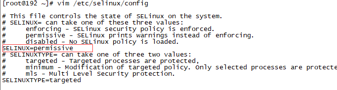 修改/etc/selinux/config文件(在某些系统中,可能是/etc/sysconfig/selinux文件),将SELINUX=enforcing修改为SELINUX=permissive: