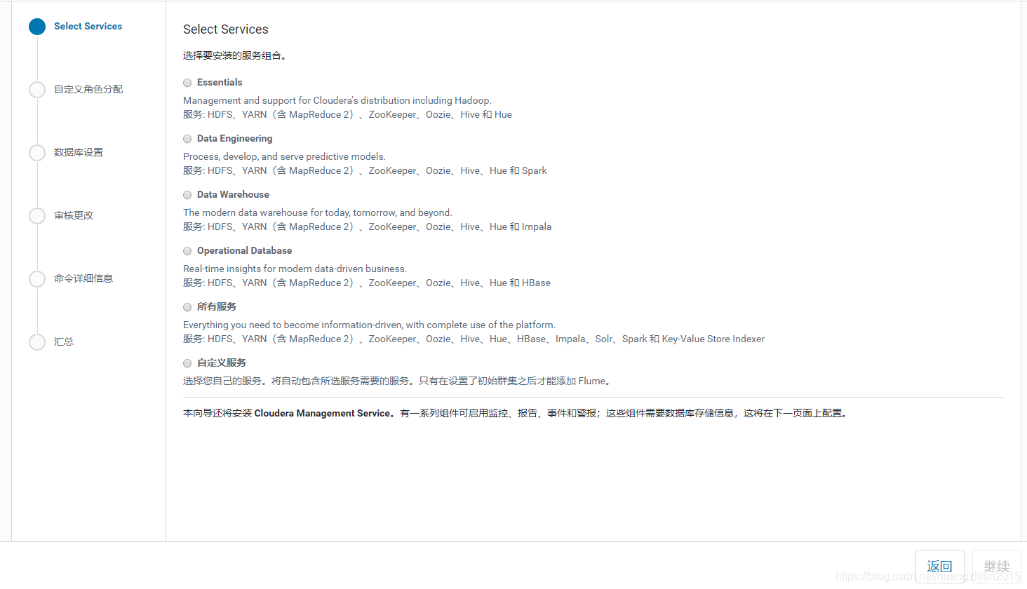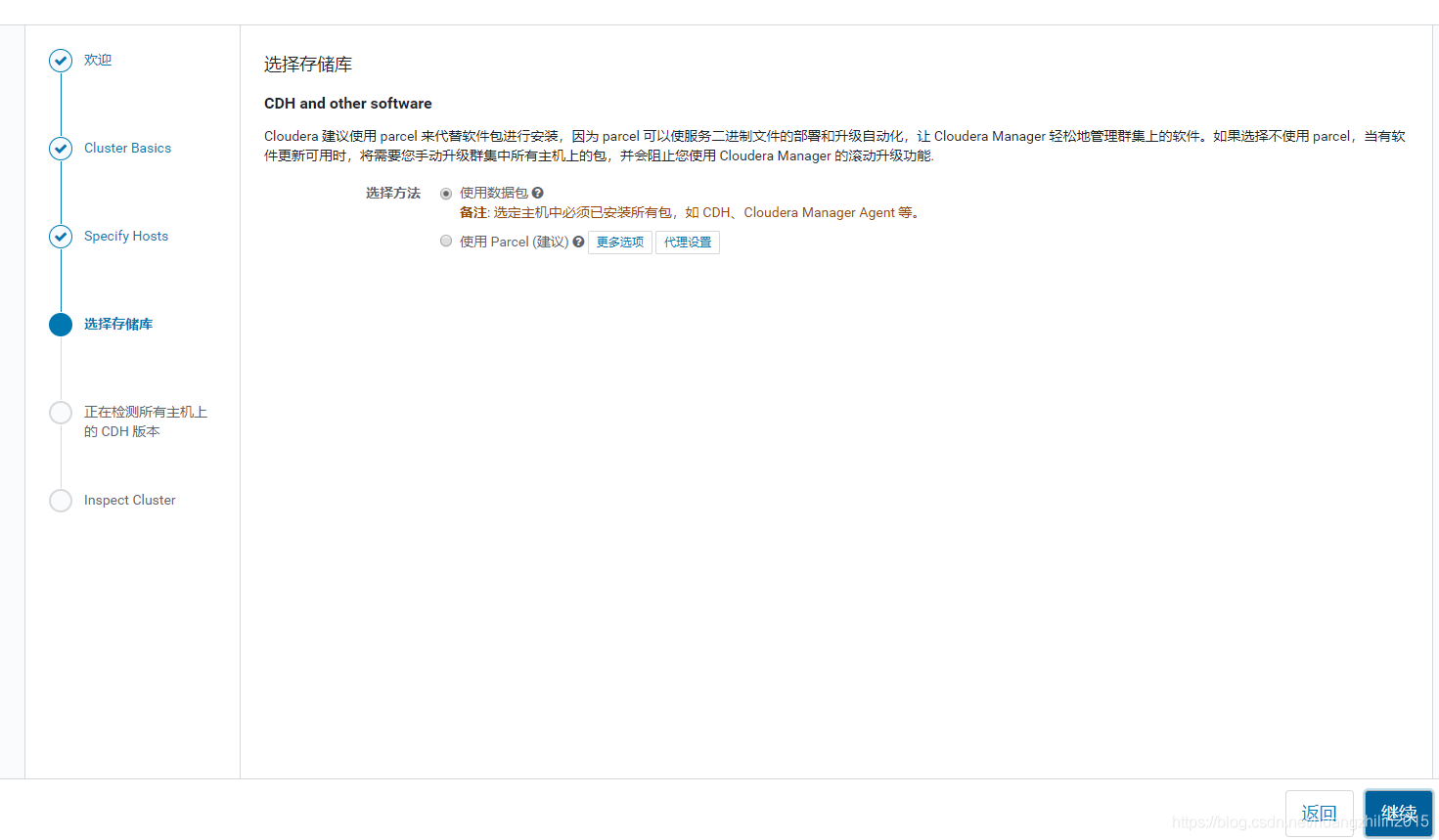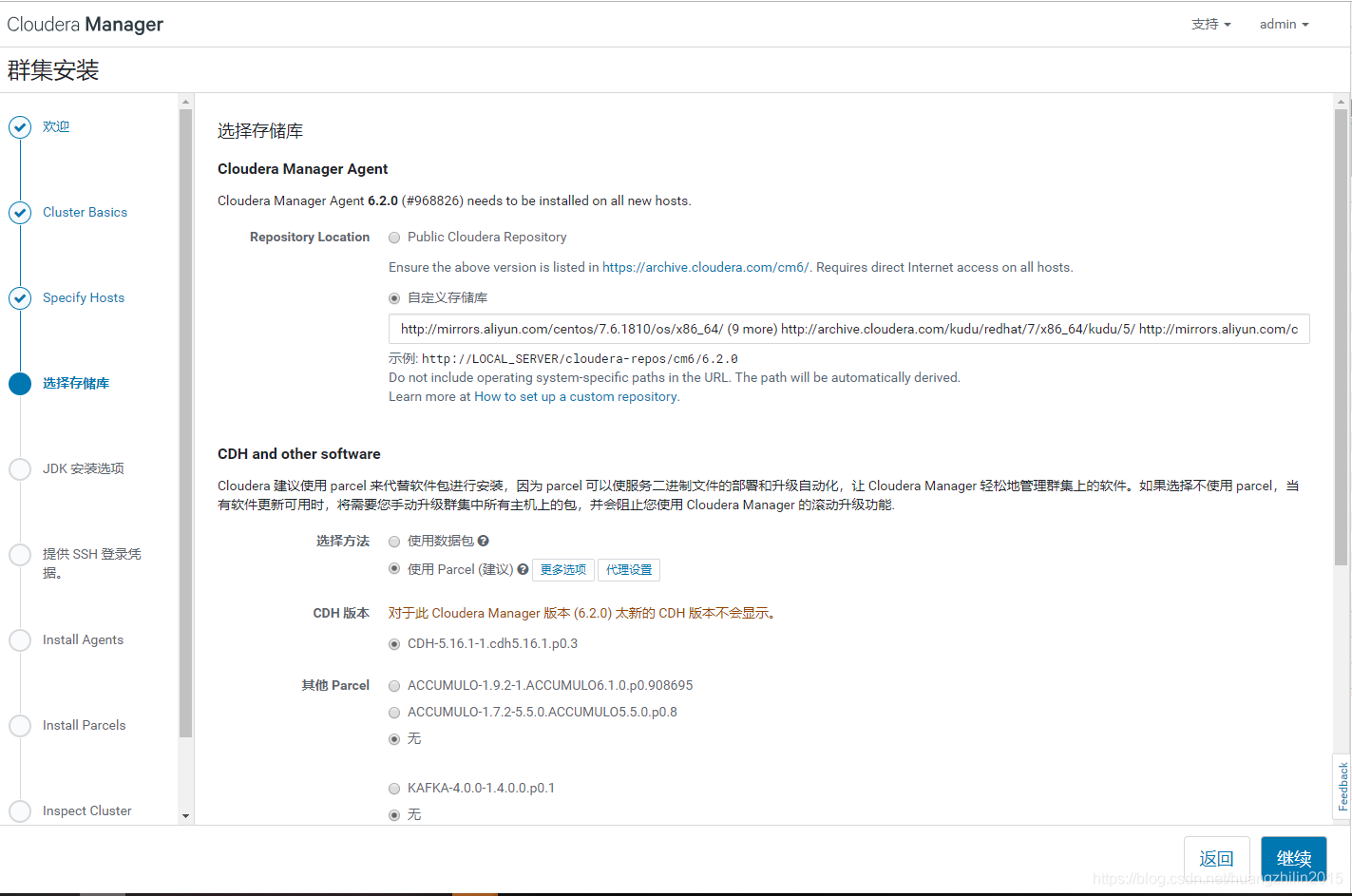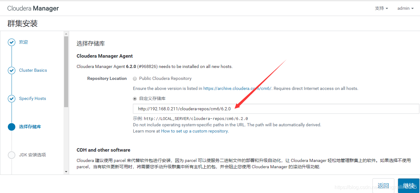注:离线安装只是针对CM、CDH、数据库等较大的模块,中途如果需要安装其它相关依赖的组件,还是选择的在线安装,这些组件都很小不会有什么影响。如果使用的虚拟机实在没有网络,那么下载到宿主机之后上传安装也可以,只是需要自己处理一些依赖。