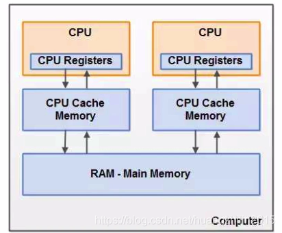 上图中的本地内存A、B就是线程各自的工作内存,要注意这个工作内存只是一个抽象的概念,可以把它们理解为CPU中的寄存器组、高速缓存等等的一种抽象描述,目标代码最终还是会被CPU所执行,JVM也是一个应用程序,而程序只是通过指令调用这些硬件完成对应的功能而已,不同的JVM厂商可以有自己的实现;而主存可以和我们的计算机内存类比,但是并不等同,它只是表示JVM使用的内存中的一部分而已。
