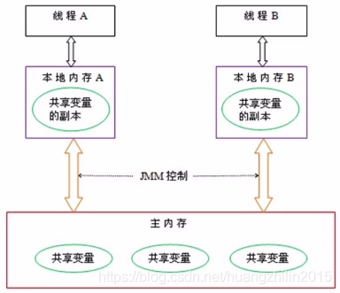 JMM作为虚拟机规范的一部分内容,规定了:每个线程都有自己的工作内存,工作内存中的“共享变量”只是主存共享变量在本地的私有拷贝,对数据的操作都只能在工作内存中进行,更新之后需要同步回主存,而不同的线程之间无法访问其它线程工作内存里的变量,线程之间值的传递必须通过主存来完成等等。如下图所示(网图):