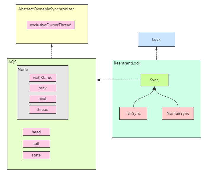 - AQS是抽象类AbstractQueuedSynchronizer的缩写,ReentrantLock中定义了静态内部类Sync继承自AQS,并且分别有静态内部类:公平锁FairSync和非公平锁NonfairSync继承自Sync