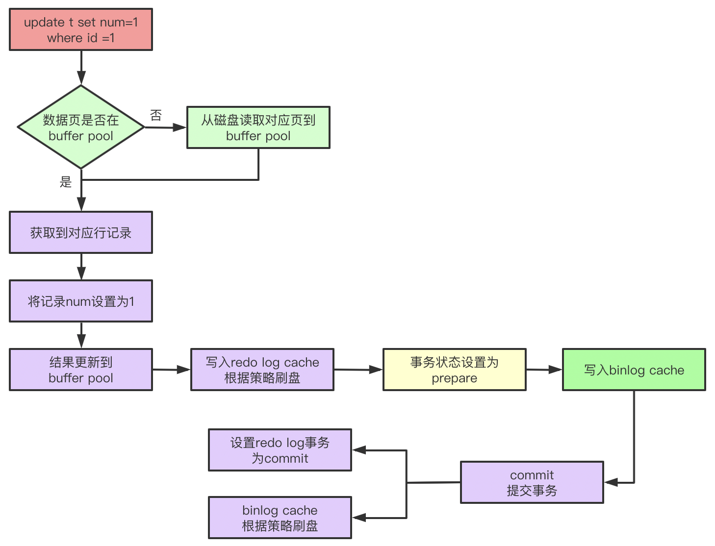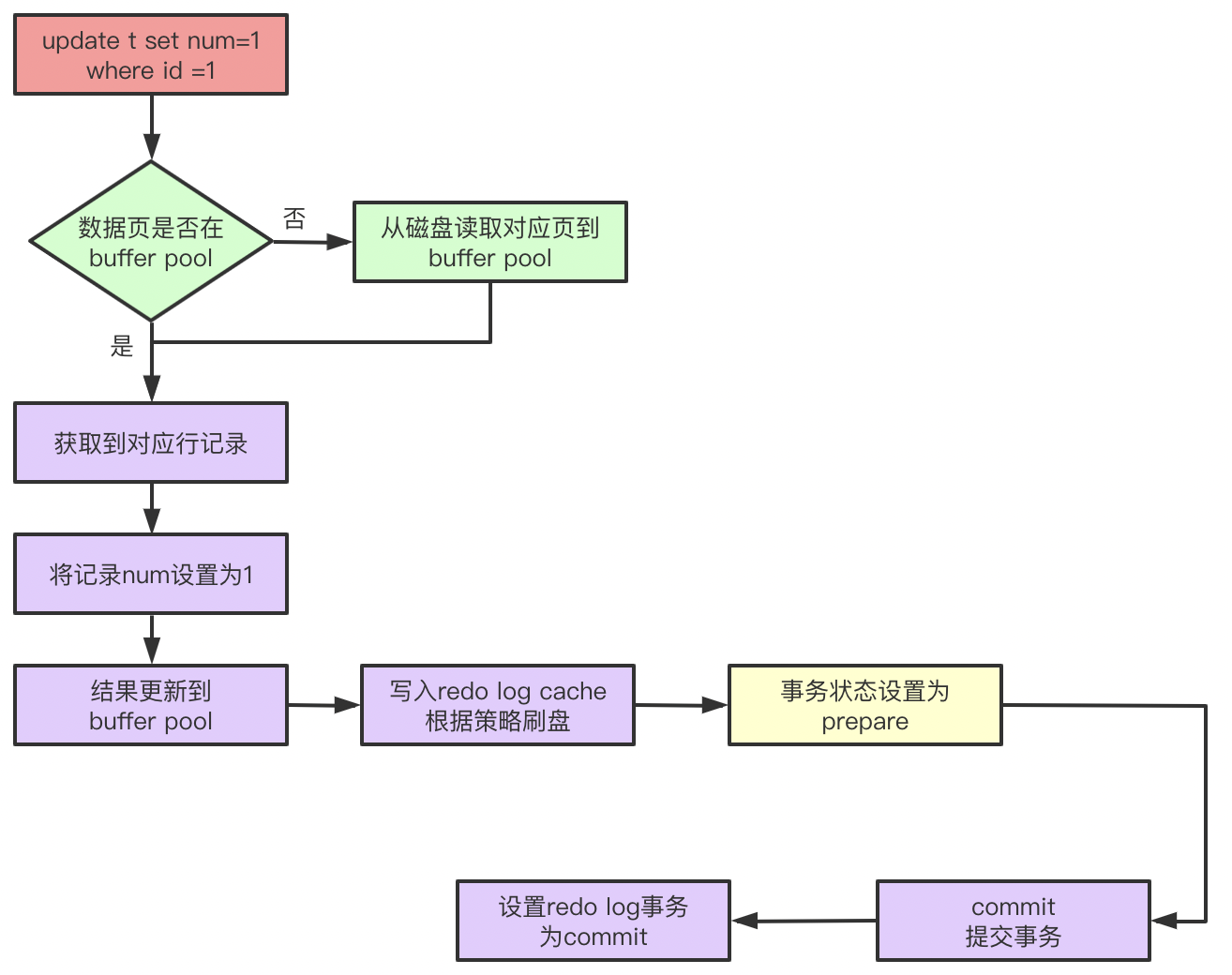 有了buffer pool的介绍,我们知道记录会先在buffer pool中更新,当pool中更新之后会在redo log buffer中添加对应的记录,记录某个数据页上做了什么修改,事务会被设置为prepare状态,这个时候就可以开始根据策略刷盘了,然后等待Server层处理(比如binlog写入),在事务提交之后,标识redo log为已提交。