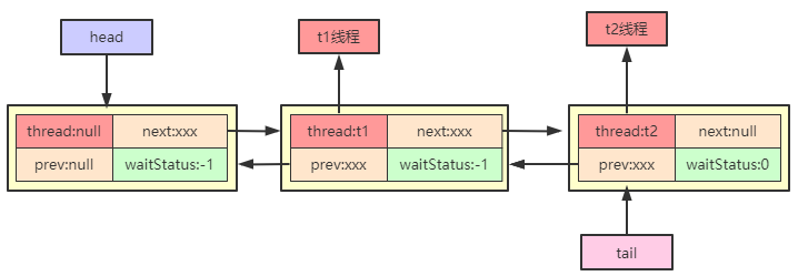 如果没能成功获取到信号量,就需要进入阻塞的逻辑,按照CLH队列的逻辑,如果现在要两个排队线程t1和t2,那么队列可能是下面两种情况:
