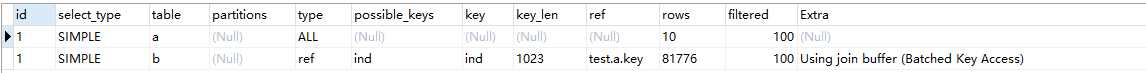 这里没有开启batched_key_access,可以看到,a是驱动表,b.key字段上有索引,查询字段使用的是a.*,b.*,所需数据需要回表,但是还是使用的是NLJ算法,现在开启batched_key_access试试: