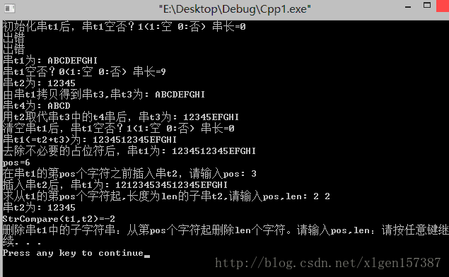 从第2位置起删除2个元素后串t1为:1234534512345EFGHI