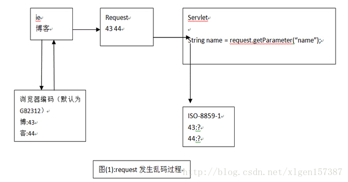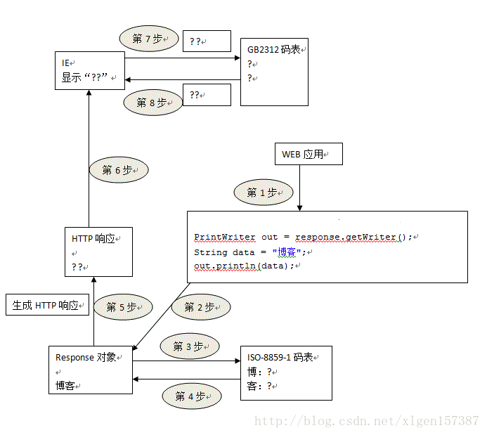 原因:"博客"首先被封装在response对象中,因为IE和WEB服务器之间不能传输文本,然后就通过ISO-8859-1进行编码,但是ISO-8859-1中没有“博客”的编码,因此输出“??”表示没有编码;