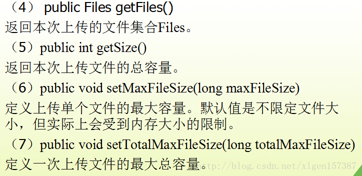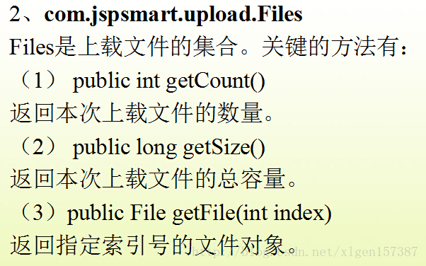 Files collection=upload.getFiles(); //获得上传文件的集合