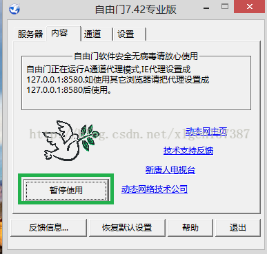 (注意:到此自。。由。。门的任务已经完成,我们可以直接退出,或者点击“暂停使用”,就可以了,不然的话我们无法正常上网了!)