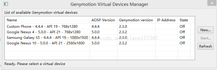 (8)选择以前安装的模拟器,点击start即可(在这里边也可以创建等操作!so easy!)