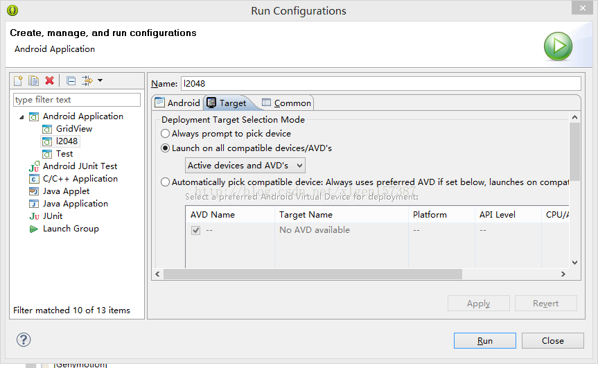 点击你的项目右键--run as--run configuration --target-- 找到第二个选项 选择 active devices and 、AVD就可以了!