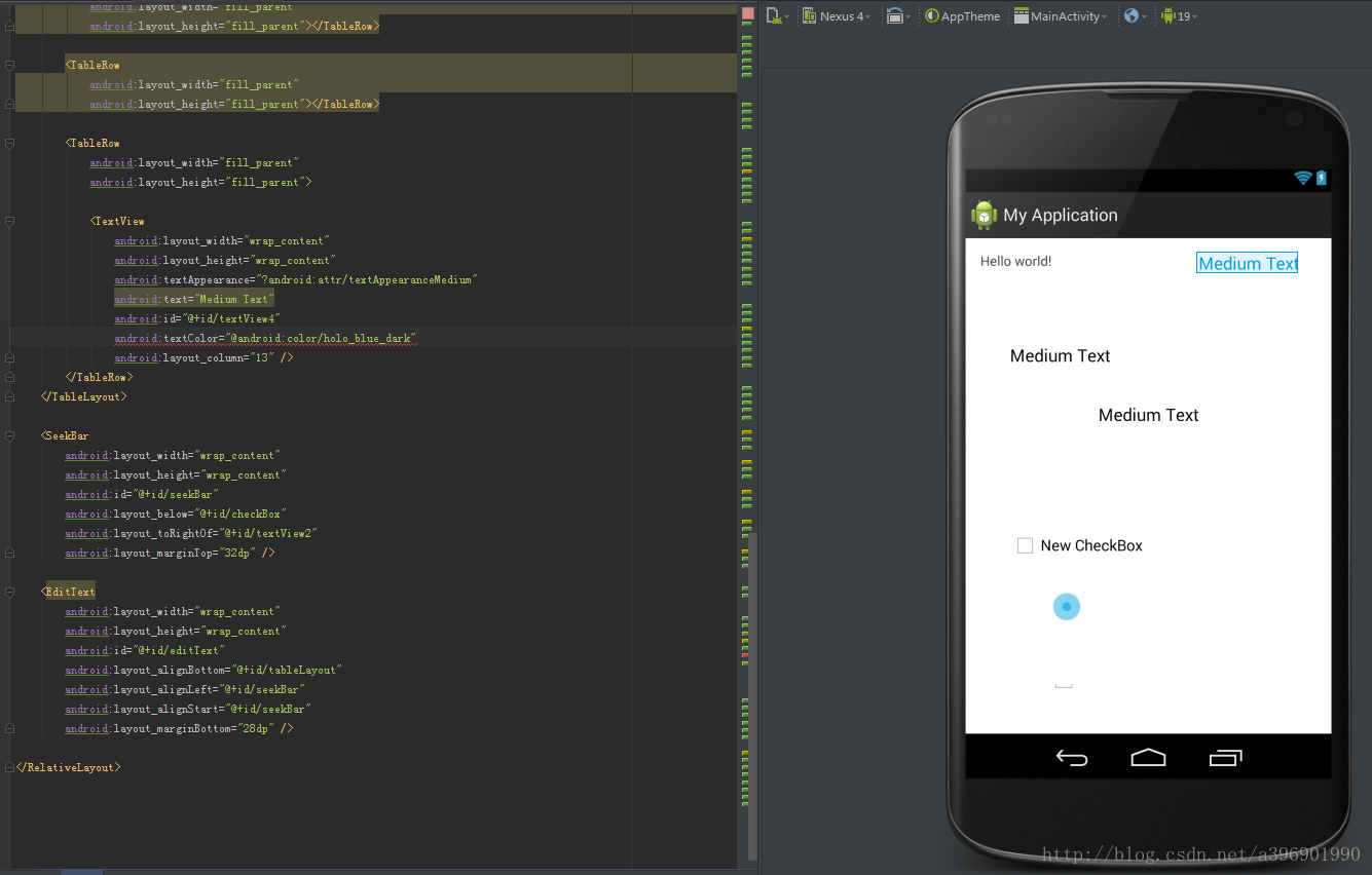 强大UI编辑界面:旁边就可以直接显示出UI效果,不用像Eclipse中调整一下控件,切换一下Tab,看一眼效果后再切回来继续调整。