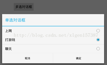 builder.setSingleChoiceItems(new String[]{"上网", "打游戏", "聊天"}, -1, new DialogInterface.OnClickListener() {