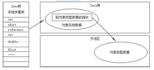 另外,在 Java 堆中还必须包含能查找到此对象类型数据(如对象类型、父类、 实现的接口、方法等)的地址信息,这些类型数据则存储在方法区中。