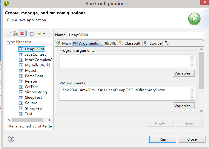 为了能够看到内存溢出时候的状态信息,在项目右键–run as –run configuration –Arguments